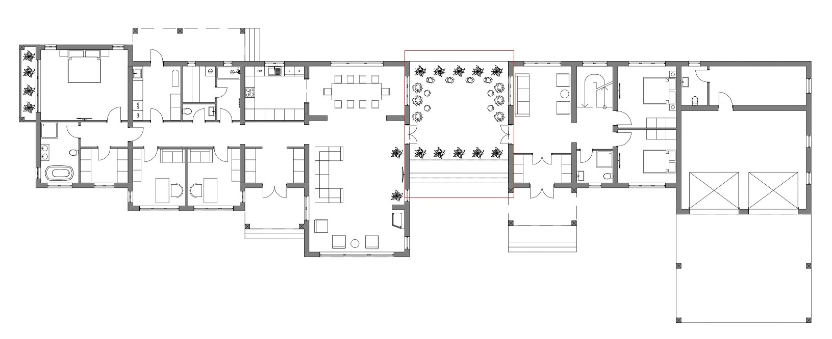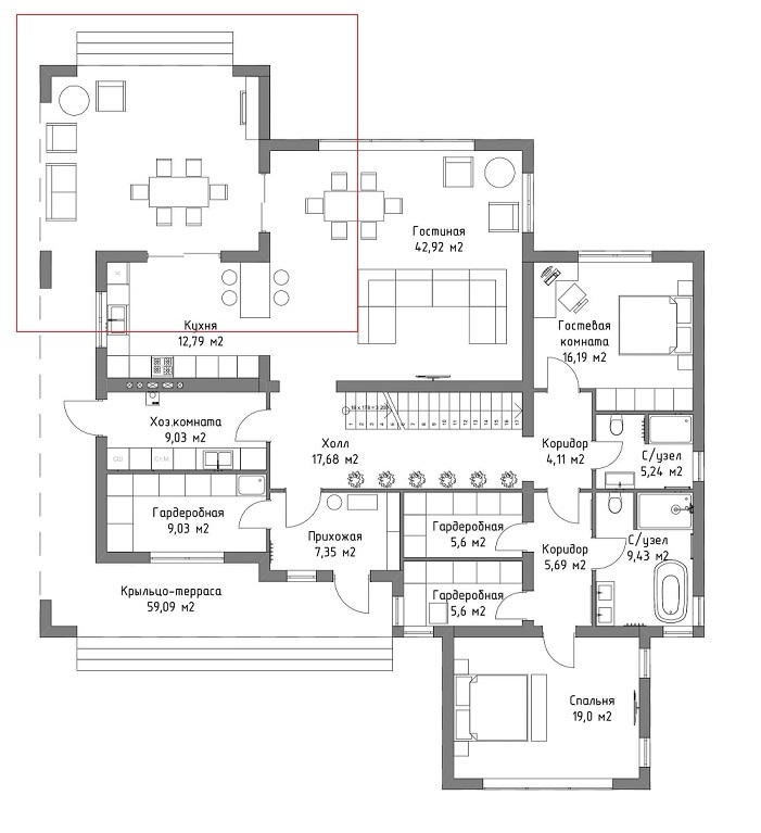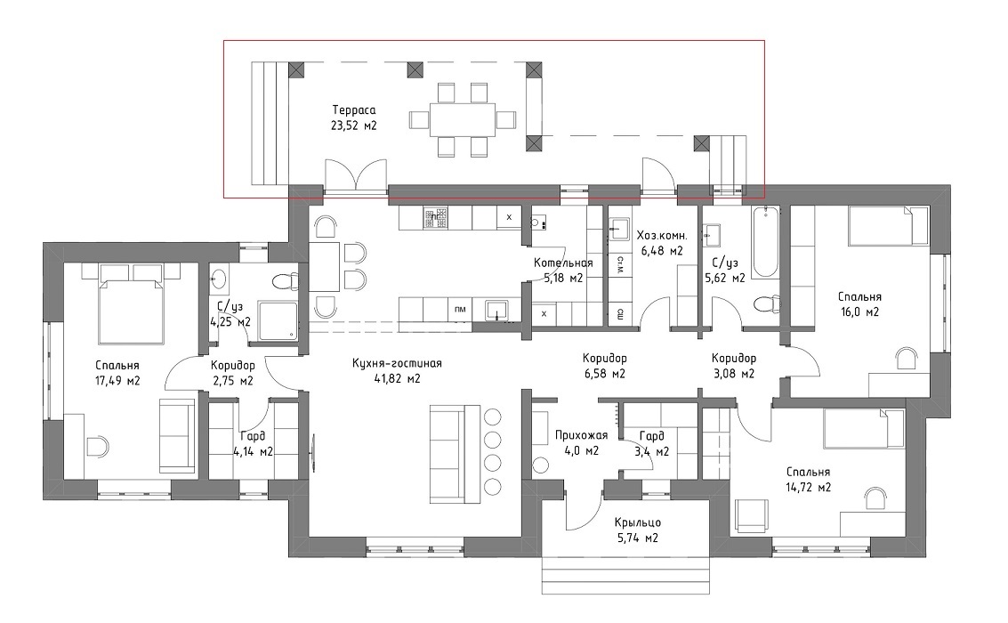 Естественно, что такой запрос по террасе, требует планировку дома определенным образом организовать. И одно дело, когда участок большой или широкий и дом можно разместить на нем хоть так, хоть сяк — тогда, конечно, можно разные планировочные решения найти и всё между собой увязать.