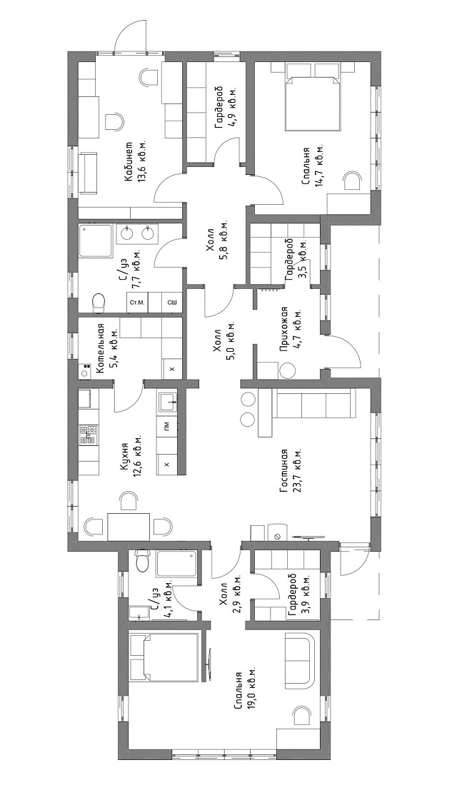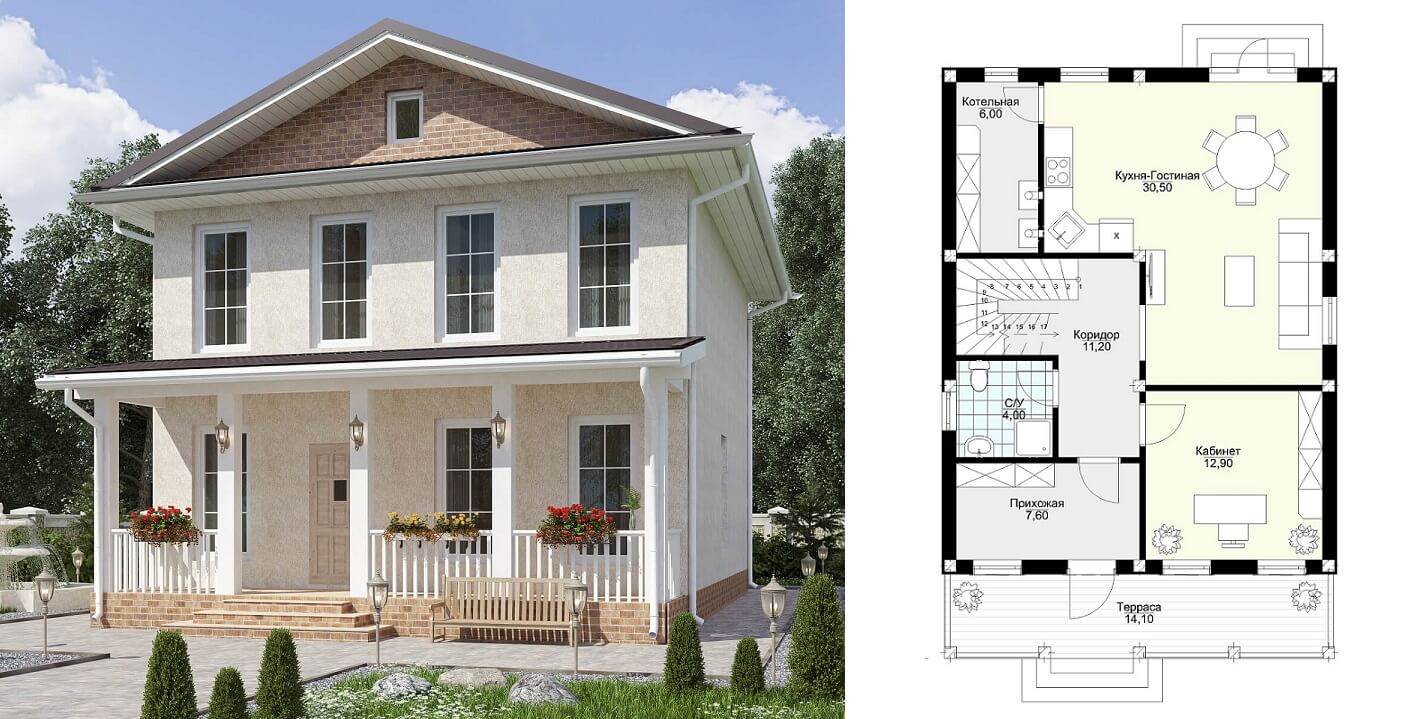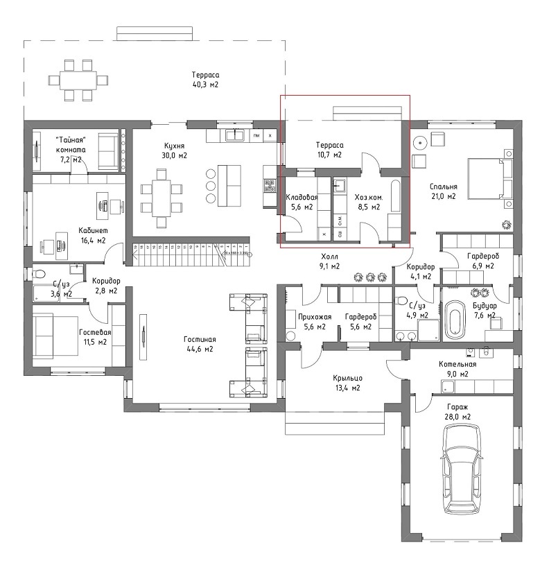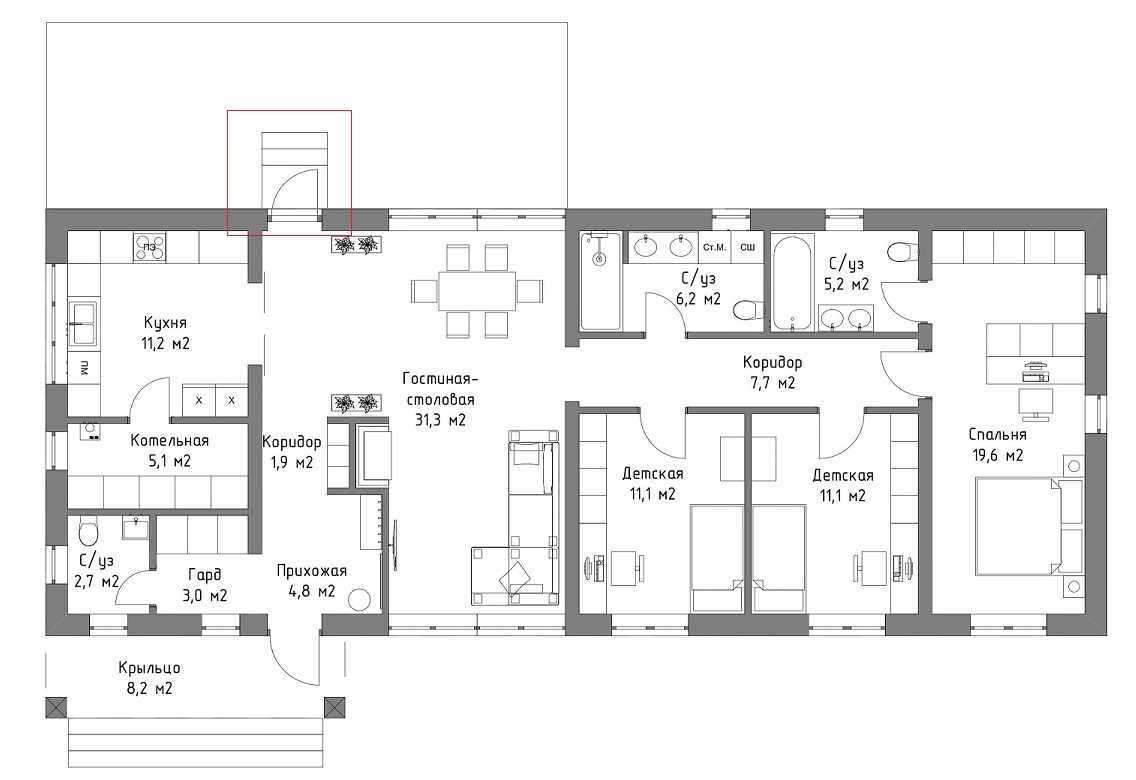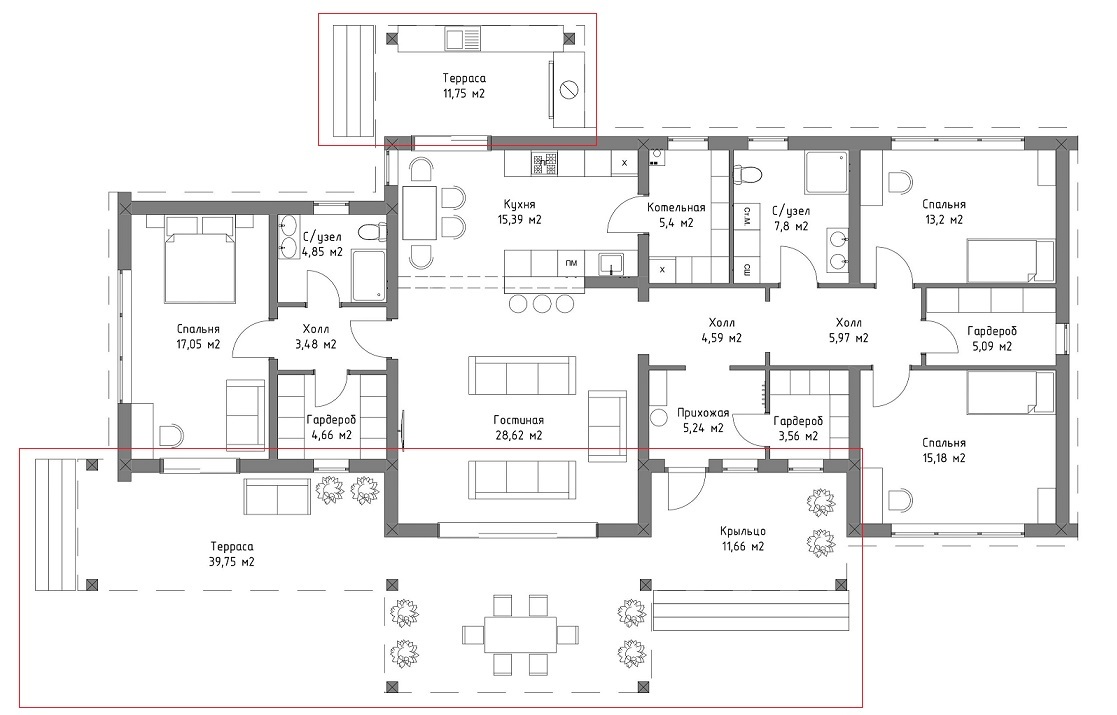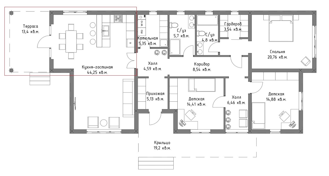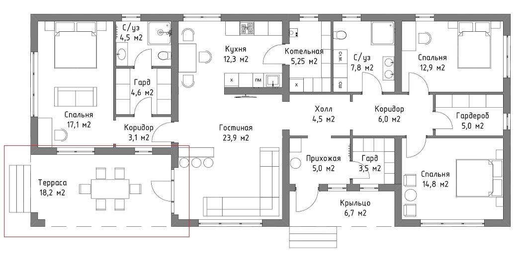 Такая планировка с террасой уместна, когда дом размещается на участке своей широкой стороной, когда участка достаточно, чтобы дом таким образом повернуть.